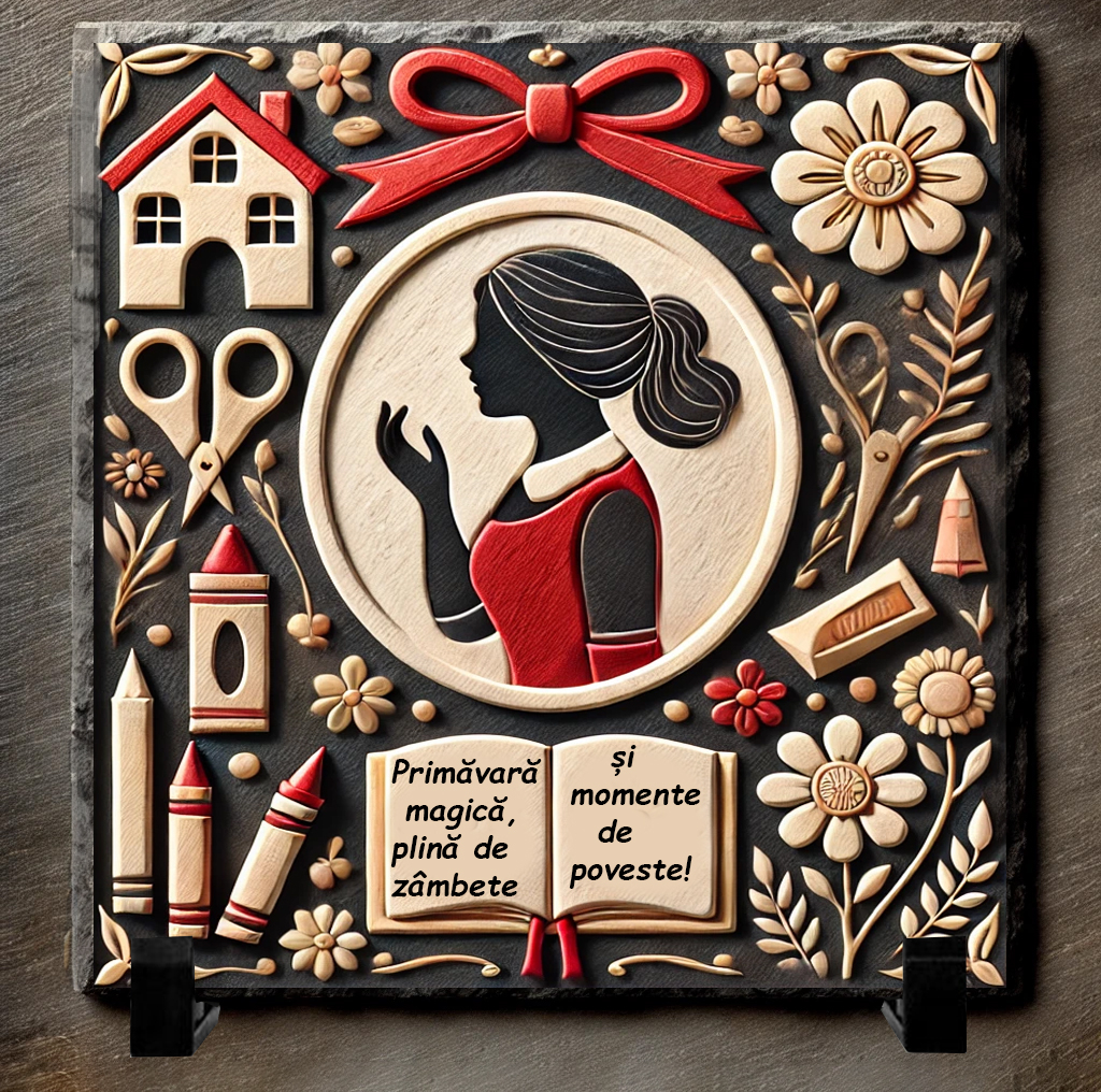 Designul tabloului îmbină un text personalizat cu un fundal artistic, decorat cu simboluri specifice copilăriei: creioane colorate, jucării, cărți ilustrate și motive florale ce evocă prospețimea primăverii și magia învățării. Alegeți un mesaj care să exprime recunoștința pentru dedicarea cu care educatoarea contribuie la creșterea și dezvoltarea copiilor – fie că este o urare de primăvară plină de lumină și bucurii, o mulțumire pentru dragostea și răbdarea oferite celor mici, sau un mesaj inspirațional care să evidențieze importanța rolului său în viața copiilor. Textul va fi imprimat pe un fundal rafinat, completat de detalii care sugerează căldură, creativitate și delicatețe.