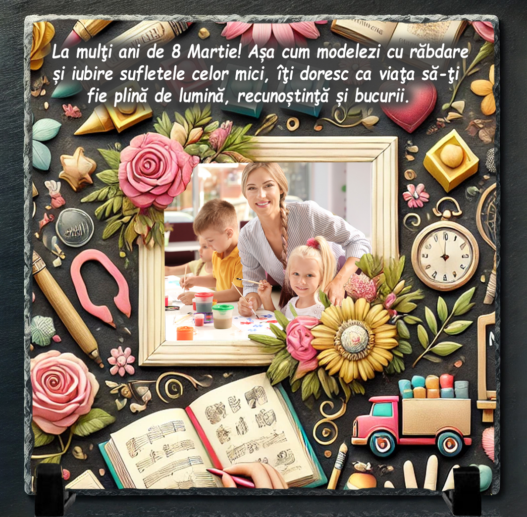 O educatoare este prima rază de lumină în drumul unui copil către cunoaștere, o persoană cu suflet mare, răbdare infinită și iubire pentru cei mici. Cu ocazia Zilei Internaționale a Femeii, oferă-i un cadou unic și personalizat – un tablou din piatră naturală de ardezie, decorat cu un mesaj emoționant și, dacă dorești, o fotografie care să surprindă pasiunea și devotamentul ei față de copii. Acest cadou va deveni un simbol al respectului și recunoștinței pentru grija, căldura și energia pe care le oferă fiecărui copil.
