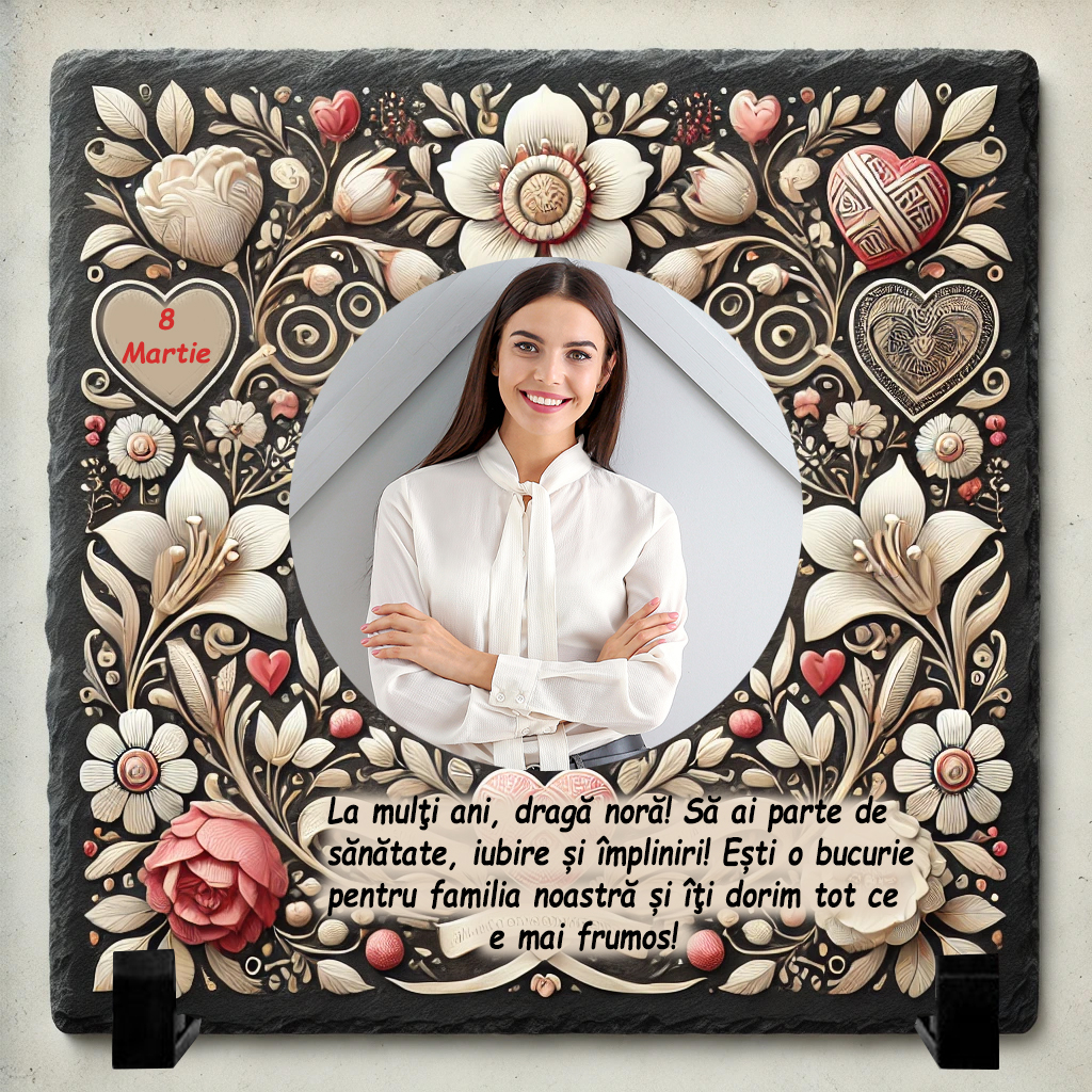 Acest tablou poate fi personalizat cu un mesaj care să exprime aprecierea și recunoștința pentru nora ta. Poți alege o urare caldă de 8 Martie, un gând inspirațional despre frumusețea și bunătatea ei sau un mesaj care să sublinieze rolul său special în familie. De asemenea, dacă vrei să adaugi un element personal, poți include o fotografie care să reflecte legătura voastră – fie un moment important al familiei, fie o imagine care simbolizează dragostea și respectul vostru reciproc.