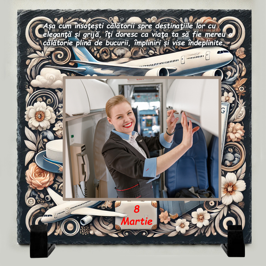 O stewardesă este mai mult decât un însoțitor de bord – este un simbol al eleganței, al aventurii și al profesionalismului, având grijă de fiecare pasager și purtând cu ea visul de a explora lumea. Cu ocazia Zilei Internaționale a Femeii, oferă-i un cadou unic și personalizat – un tablou din piatră naturală de ardezie, decorat cu un mesaj inspirațional și, dacă dorești, o fotografie care să surprindă pasiunea și frumusețea meseriei sale. Acest cadou va deveni un simbol al recunoștinței pentru devotamentul, eleganța și spiritul ei de aventurieră.