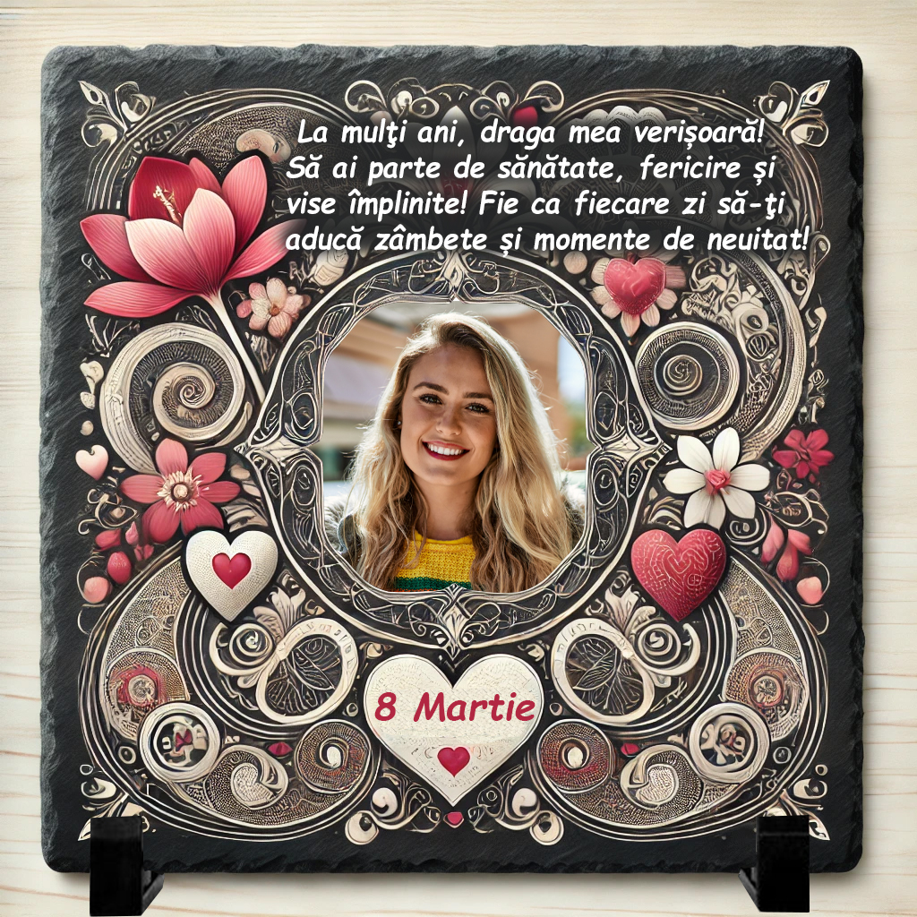 Verișoara ta este mai mult decât o rudă – este o prietenă apropiată, o persoană cu care ai împărtășit momente frumoase și amintiri de neuitat. Cu ocazia Zilei Internaționale a Femeii, oferă-i un cadou unic și personalizat – un tablou elegant, decorat cu un mesaj emoționant și, dacă dorești, o fotografie care să reflecte legătura voastră specială. Acest cadou simbolizează prietenia, dragostea și respectul pe care i le porți.