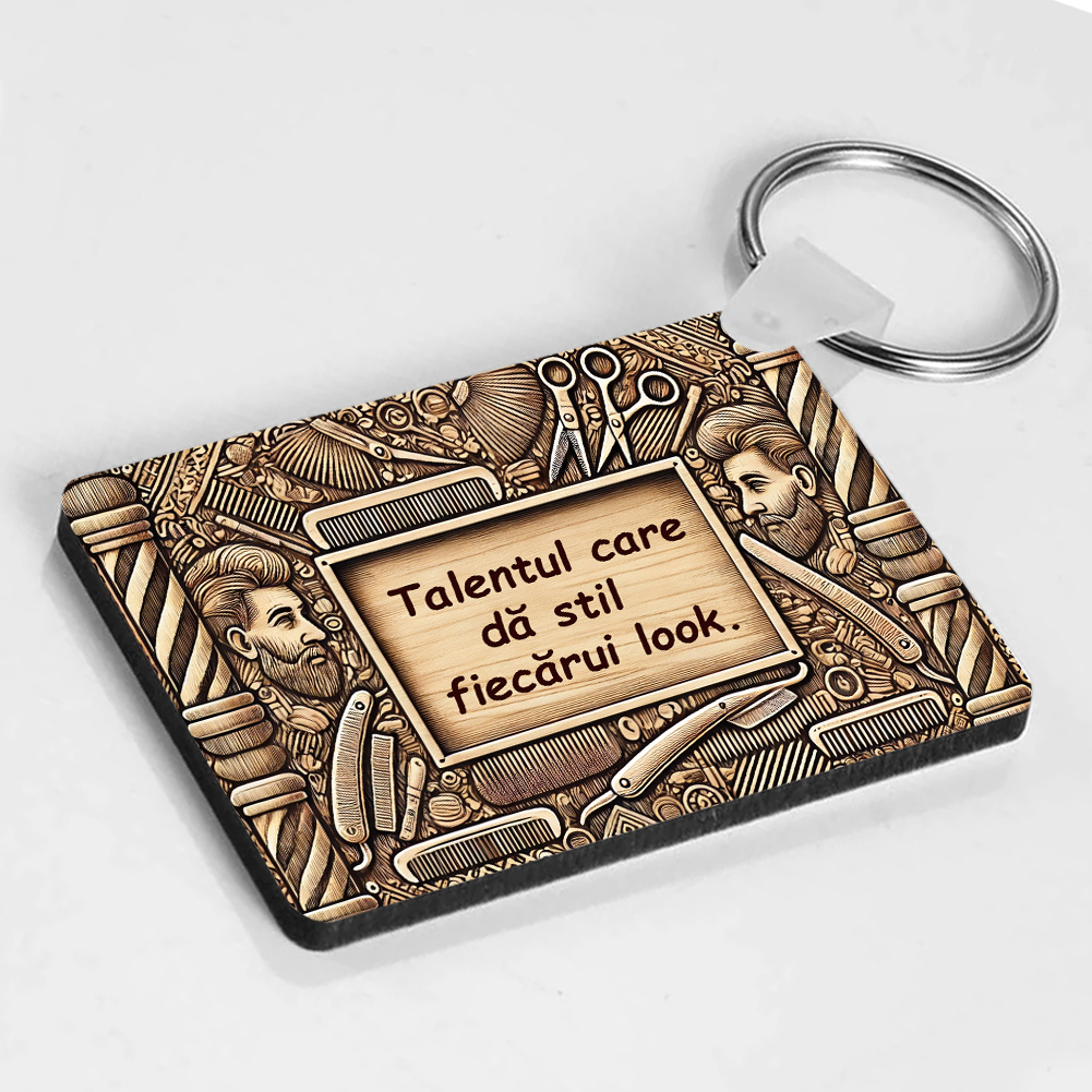 Breloc din lemn creat special pentru frizeri, dimensiune 5.5x4 cm, un simbol al talentului și grijii cu care modelează stilurile și încrederea clienților. Realizat din lemn de calitate, acest breloc are un design inspirat din elementele specifice meseriei – foarfece, pieptene și mașină de tuns – evocând îndemânarea, pasiunea și atenția la detalii care definesc un frizer. Ideal pentru a fi atașat la chei, la trusa de lucru sau la uniforma de salon, brelocul devine un accesoriu simbolic, reamintindu-i de dedicarea și profesionalismul său.