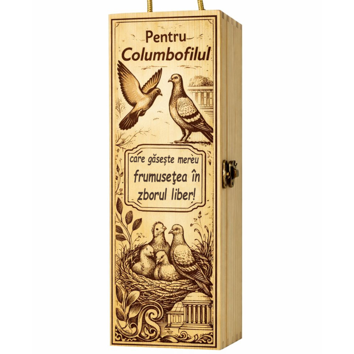 Realizată din lemn natural, cu finisaj rustic, proiectată pentru o sticlă de 750 ml. Designul poate include elemente simbolice ce reflectă dragostea pentru columbofilie și eleganța acestui hobby.