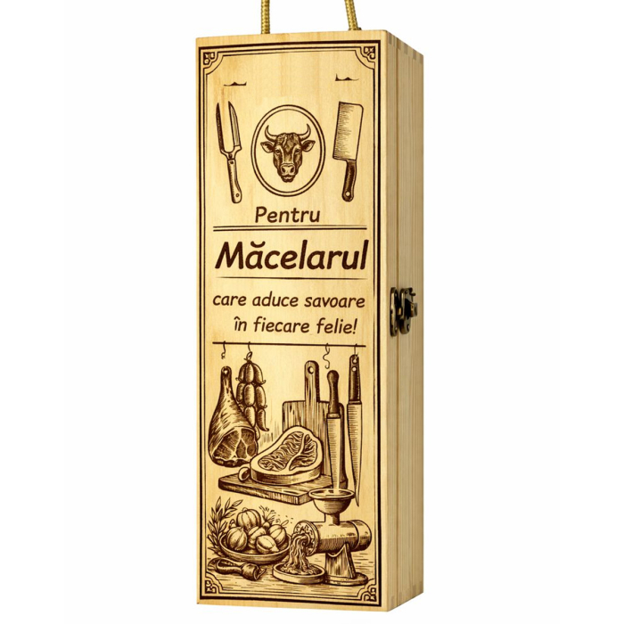 ✔ Cutie de vin personalizată: realizată din lemn natural, cu finisaj rustic și design tematic adaptat pentru un măcelar. Se potrivește perfect unei sticle de 750 ml și adaugă o notă de distincție oricărui gest de apreciere.