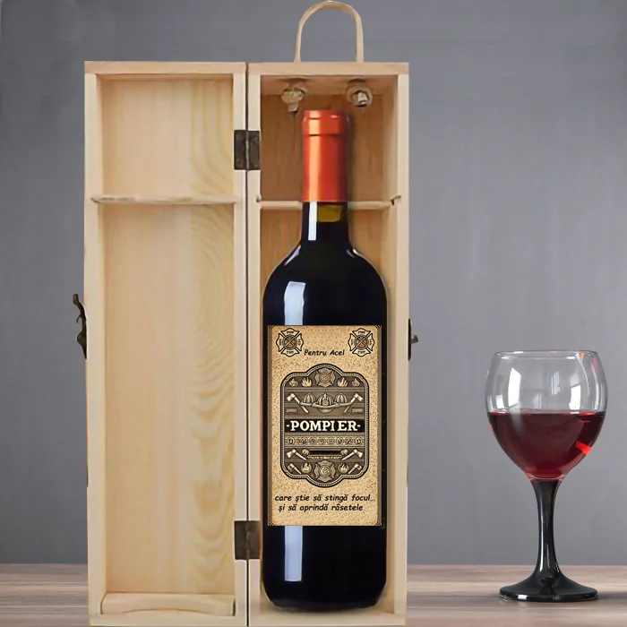 Fabricată din lemn natural, cu finisaj rustic și design inspirat din tematica serviciilor de intervenție. Găzduiește perfect o sticlă de 750 ml și este ideală pentru a fi oferită cu ocazii oficiale sau personale.