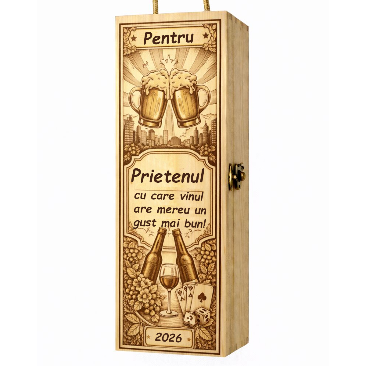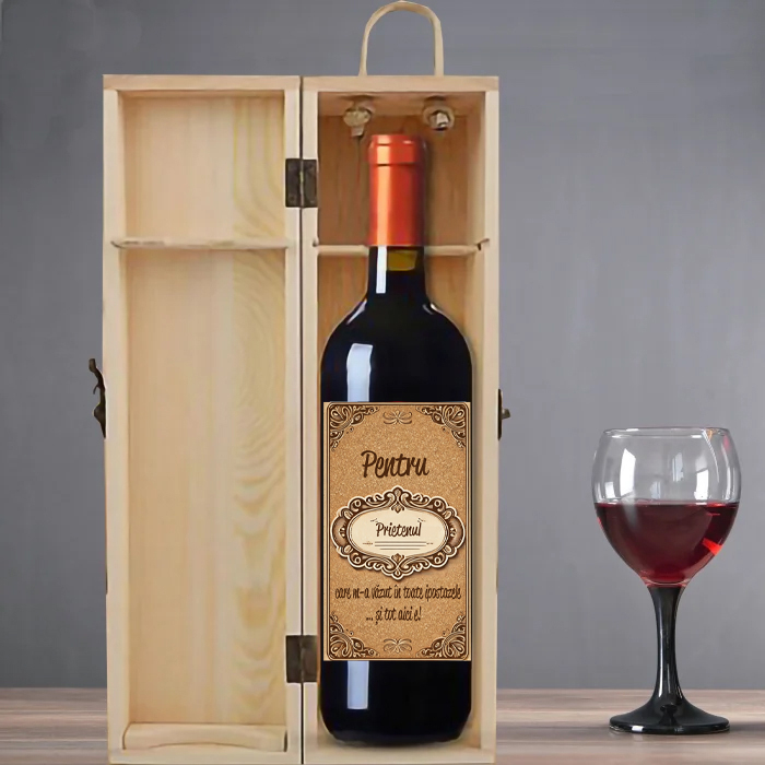 ✔ Cutie de vin personalizată: realizată din lemn natural, cu finisaj rustic și design tematic adaptat pentru un prieten. Se potrivește perfect unei sticle de 750 ml și adaugă o notă de distincție cadoului.