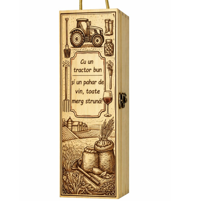 Confecționată din lemn natural cu finisaj rustic, dedicată unei sticle de 750 ml. Designul tematic reflectă respectul față de tradiția muncii pământului și oferă o notă elegantă oricărei ocazii.