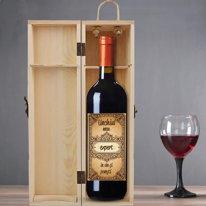 ✔ Cutie de vin personalizată: realizată din lemn natural, cu finisaj rustic și design tematic adaptat pentru un unchi. Se potrivește perfect unei sticle de 750 ml și adaugă o notă de distincție oricărui cadou.