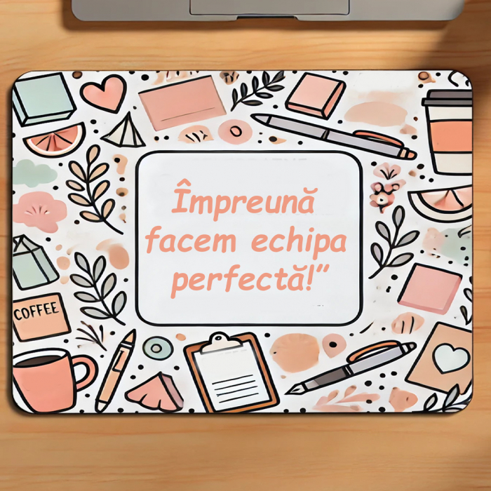 Adaugă o notă de profesionalism și prietenie biroului tău cu mousepad-ul tematic „Colega”, ideal pentru a celebra legătura de colaborare și sprijinul dintre colegi. Inspirat de simboluri care evocă prietenia, încrederea și momentele de echipă, acest mousepad aduce o atmosferă prietenoasă și motivantă în spațiul de lucru. Designul subtil și elegant reflectă aprecierea pentru contribuția și energia unei colege speciale, oferind un spațiu plăcut și inspirat pentru birou. Dimensiunea A4 este perfectă pentru mișcări precise ale mouse-ului, combinând funcționalitatea cu o notă de eleganță.