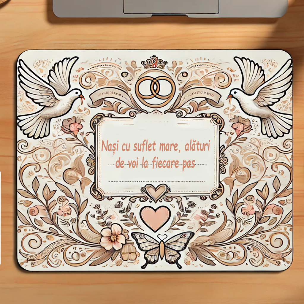 Mousepad-ul tematic „Nași” aduce o notă de rafinament și căldură în orice spațiu de lucru, fiind un accesoriu elegant și un omagiu adus acestor relații speciale din viața de familie.