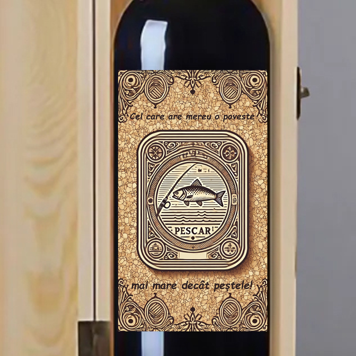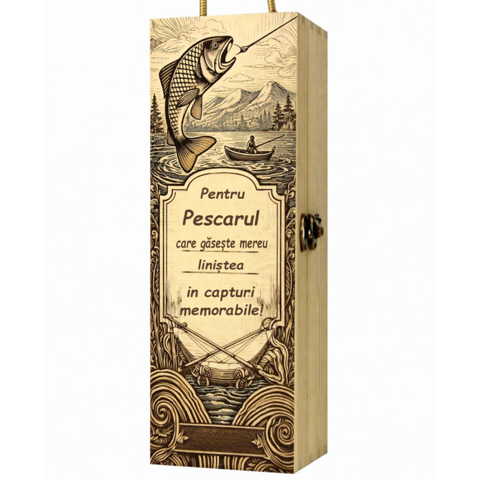 Realizată din lemn natural, cu finisaj rustic, perfectă pentru o sticlă de 750 ml. Designul tematic evocă pasiunea pentru pescuit și oferă un plus de eleganță oricărei ocazii speciale.