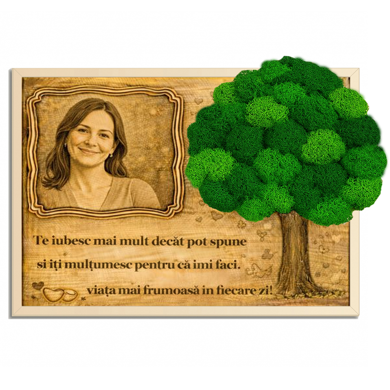 Cauți un cadou pentru soția ta care să fie romantic, personal și cu adevărat memorabil? Un tablou din lemn personalizat cu fotografie și licheni este o alegere specială atunci când vrei să transformi o amintire dragă într-o piesă de decor cu suflet. Poți alege o fotografie de la nuntă, o poză dintr-o vacanță, un moment de familie, o aniversare, o imagine „simplă”, dar care înseamnă enorm pentru voi — iar noi o integrăm într-un tablou cald, elegant și premium.