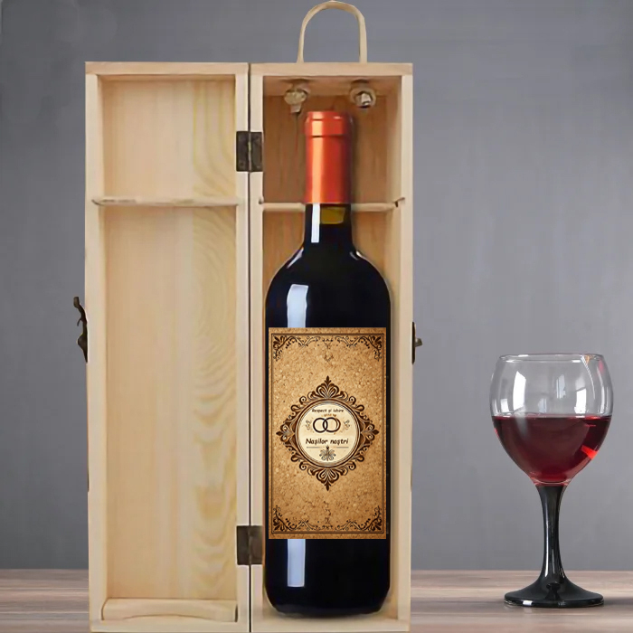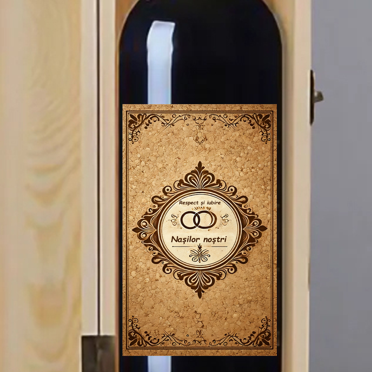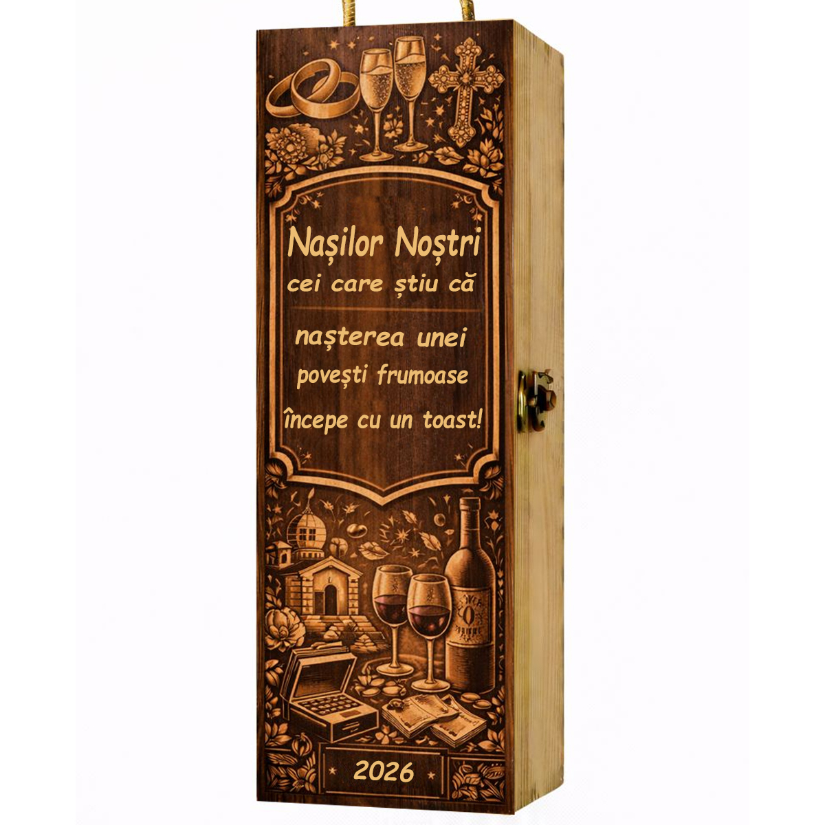 Fabricată din lemn natural, cu finisaj rustic și elegant, ideală pentru o sticlă de 750 ml. Designul tematic poate include mesaje de mulțumire și simboluri care reflectă rolul deosebit al nașilor.