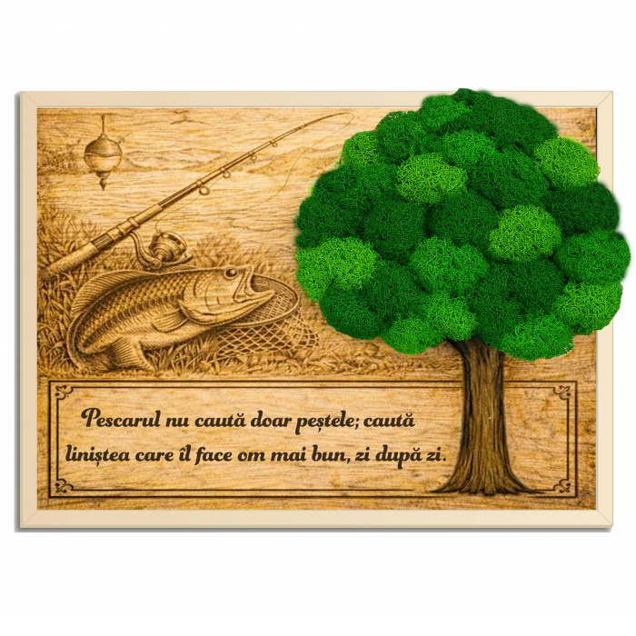 Lichenii naturali stabilizați adaugă tabloului un plus de rafinament și naturalețe: textură, volum și un accent de natură care scoate mesajul în evidență printr-un efect 3D discret. Completează perfect tema pescuitului – aer liber, apă, pădure, liniște – și face tabloul să pară mai „viu”. Fiind stabilizați, lichenii nu necesită îngrijire și își păstrează aspectul în timp, astfel încât tabloul rămâne frumos fără griji.