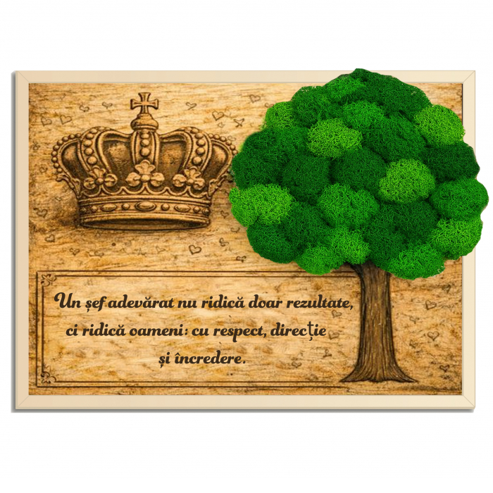 Cauți un cadou pentru șefa ta care să fie elegant, profesionist și memorabil? Un tablou din lemn personalizat cu text, completat cu licheni naturali stabilizați, este o alegere premium atunci când vrei să oferi un gest de apreciere cu bun gust. Este potrivit pentru aniversare, Crăciun, 8 Martie, promovare, aniversare în companie, finalizarea unui proiect important sau ca mulțumire din partea echipei.