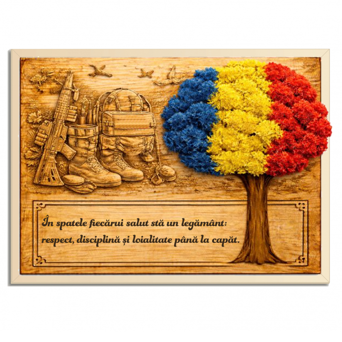 Textul ales de tine devine elementul central al tabloului, iar noi îl integrăm într-un design echilibrat, cu aspect puternic și elegant. Poți personaliza cu nume, grad, unitate, motto, dată importantă sau un mesaj scurt de recunoștință. Rezultatul este o piesă de decor premium, potrivită pentru birou, cameră, living sau spațiul personal.