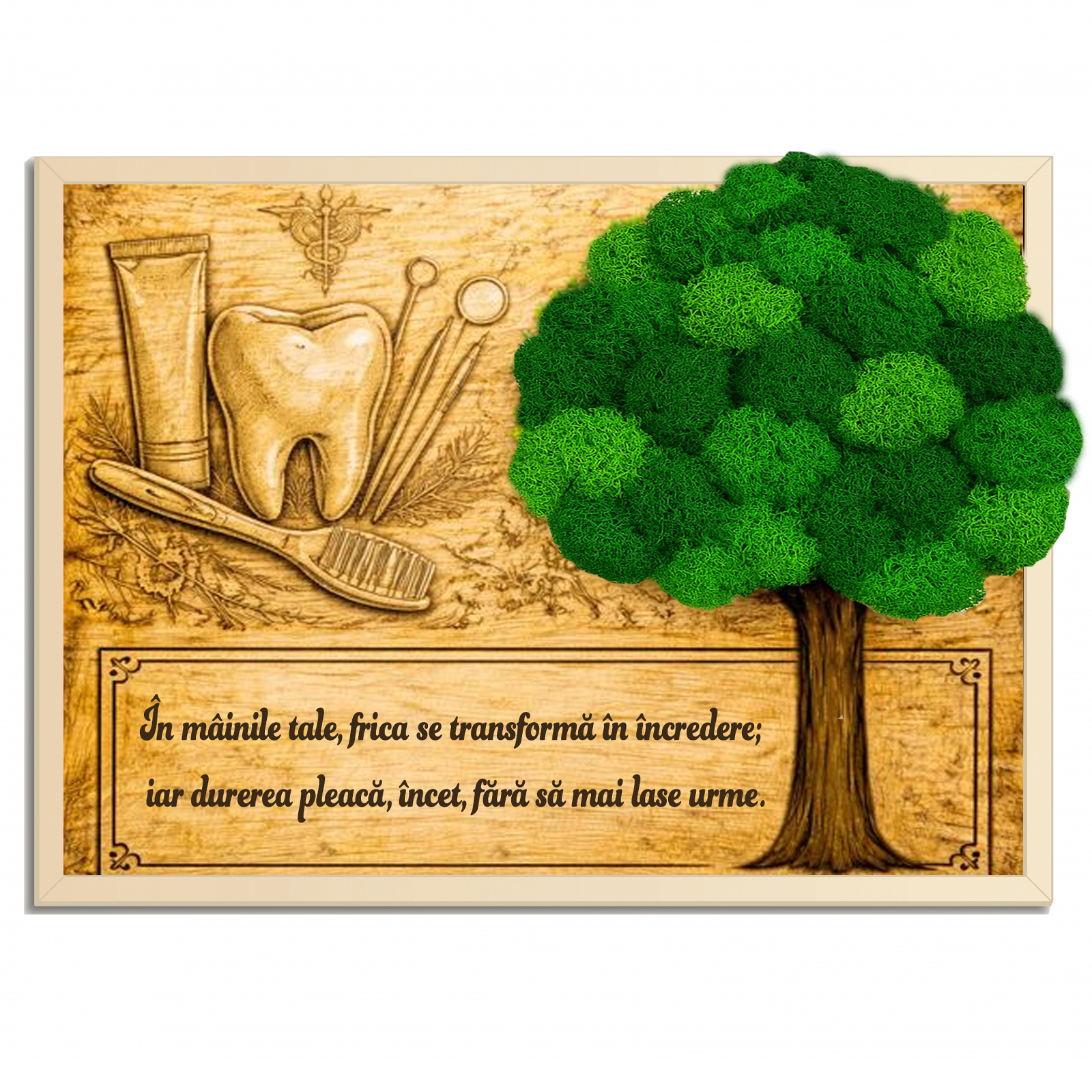Cauți un cadou pentru stomatolog care să fie elegant, profesionist și memorabil? Un tablou din lemn personalizat cu text, completat cu licheni naturali stabilizați, este o alegere premium pentru a marca o reușită importantă sau pentru a transmite apreciere într-un mod rafinat. Este potrivit pentru deschiderea unui cabinet, promovare, final de rezidențiat/specializare, aniversare profesională, zi de naștere, Crăciun sau ca mulțumire din partea pacienților, colegilor ori familiei.