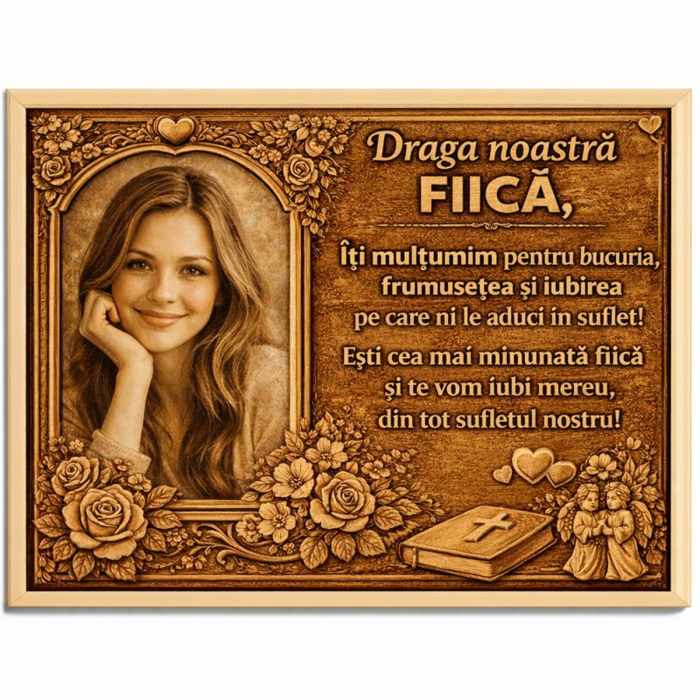 Cauți un cadou pentru fiică care să fie personal, emoționant și să rămână o amintire peste ani? Un tablou din lemn personalizat cu fotografie este perfect pentru a păstra un moment special: o poză cu voi, o fotografie din copilărie, o amintire din vacanță, o aniversare, o poză de la absolvire sau un moment spontan care o reprezintă.
