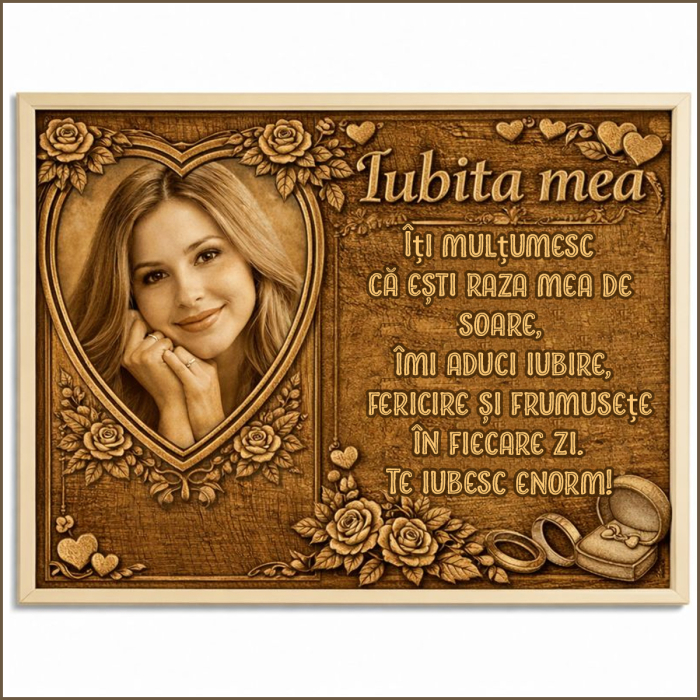 Nu este doar un tablou, ci o amintire solidă, creată să rămână în timp, datorită metodei de realizare. Imaginea este integrată într-un format durabil, cu un aspect cald și elegant, astfel încât tabloul își păstrează farmecul ani la rând. Devine o amintire a iubirii voastre – un moment „al vostru”, păstrat pentru azi și pentru mai târziu.