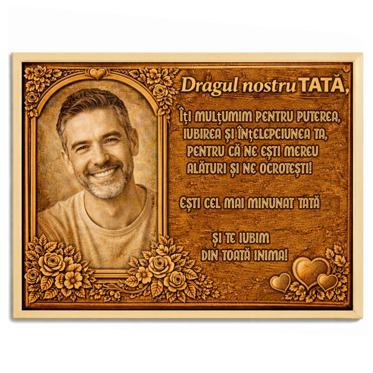 Alegi fotografia, iar noi vom folosi toate detaliile pozei tale, inclusiv fundalul, transformând-o într-o operă de artă pe lemn – un cadou unic, care îi va aminti mereu de cei dragi. Este o alegere potrivită pentru ziua lui, Ziua Tatălui, Crăciun, aniversare sau sărbători.