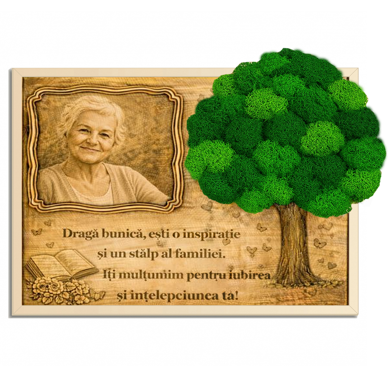 Cauți un cadou pentru bunica ta care să fie emoționant, cald și de păstrat pentru totdeauna? Un tablou din lemn personalizat cu fotografie și licheni este o alegere minunată atunci când vrei să-i oferi ceva cu adevărat special: o amintire de familie transformată într-o piesă de decor premium, cu suflet. Poți alege o fotografie cu nepoții, o poză cu voi împreună, un moment de la sărbători, o aniversare sau o imagine care îi amintește de cei dragi și de momentele frumoase.