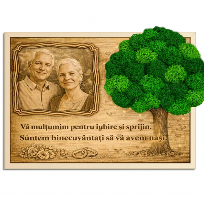 Cauți un cadou pentru nași care să fie elegant, personal și cu adevărat memorabil? Un tablou din lemn personalizat cu fotografie și licheni este o alegere specială atunci când vrei să le mulțumești pentru sprijin, pentru prezență și pentru rolul important pe care îl au în viața voastră. Poți alege o fotografie de la nuntă, cununie, botez, o poză cu voi împreună, un moment dintr-o aniversare sau un cadru care surprinde frumos legătura dintre nași și fini.