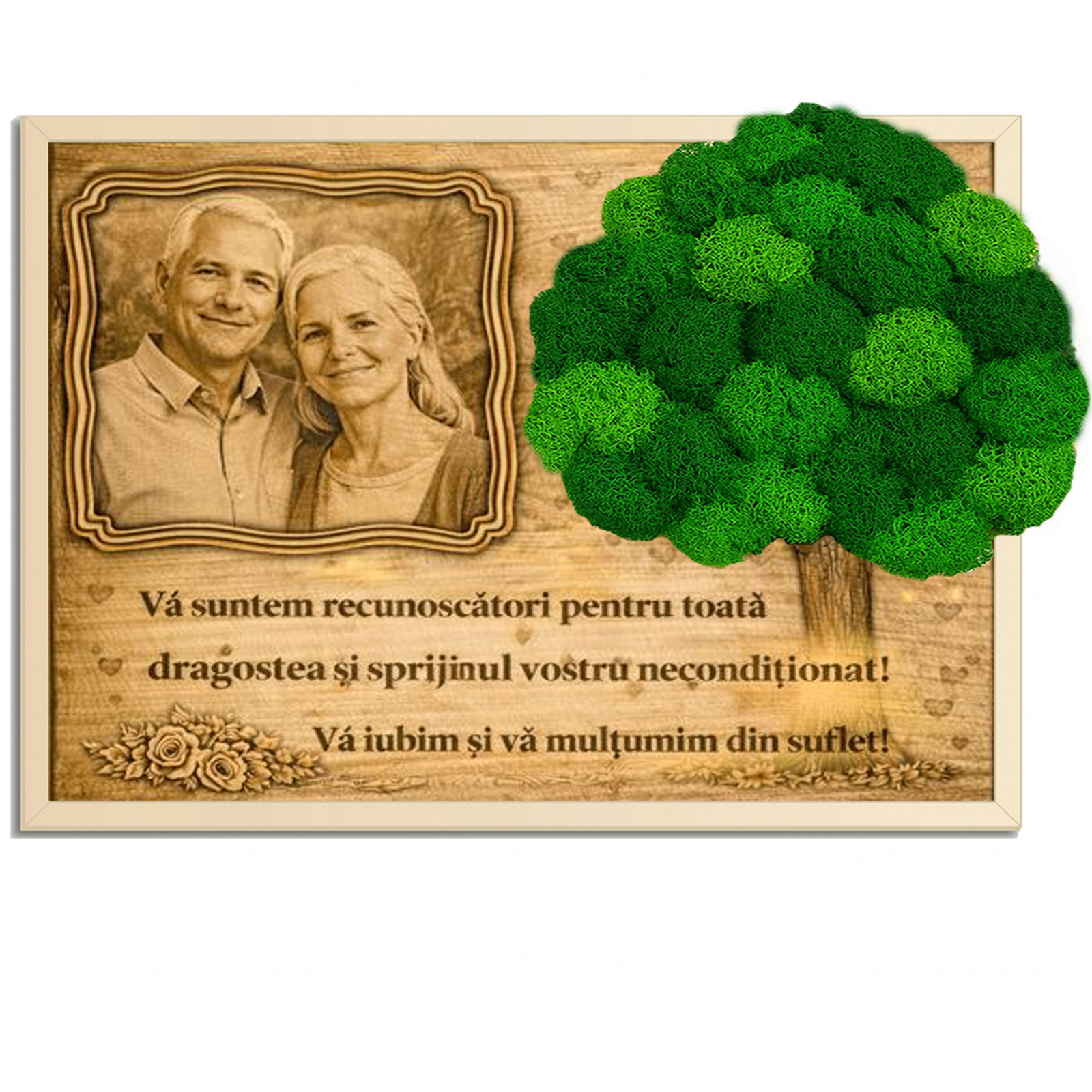 Lichenii naturali stabilizați adaugă tabloului un plus de rafinament și căldură: textură, volum și un accent discret de natură care face fotografia să pară mai „vie”. Creează un efect 3D plăcut privirii și oferă compoziției un aer premium, fără să fie încărcată. Fiind stabilizați, lichenii nu necesită îngrijire și își păstrează aspectul în timp, ceea ce îi face ideali pentru un cadou destinat părinților: frumos, durabil și fără griji. În plus, simbolic, aduc o notă de liniște, echilibru și continuitate — exact valorile care stau la baza unei familii.