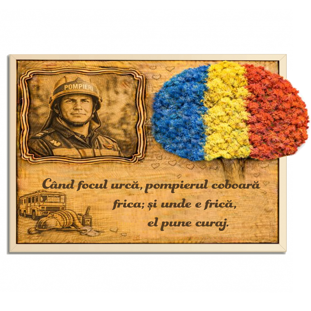 Tu alegi fotografia, noi o pregătim cu atenție pentru a arăta impecabil pe lemn. Păstrăm detaliile importante, inclusiv fundalul (unitatea, autospeciala, echipa, atmosfera), ca tabloul să redea autentic mândria momentului.