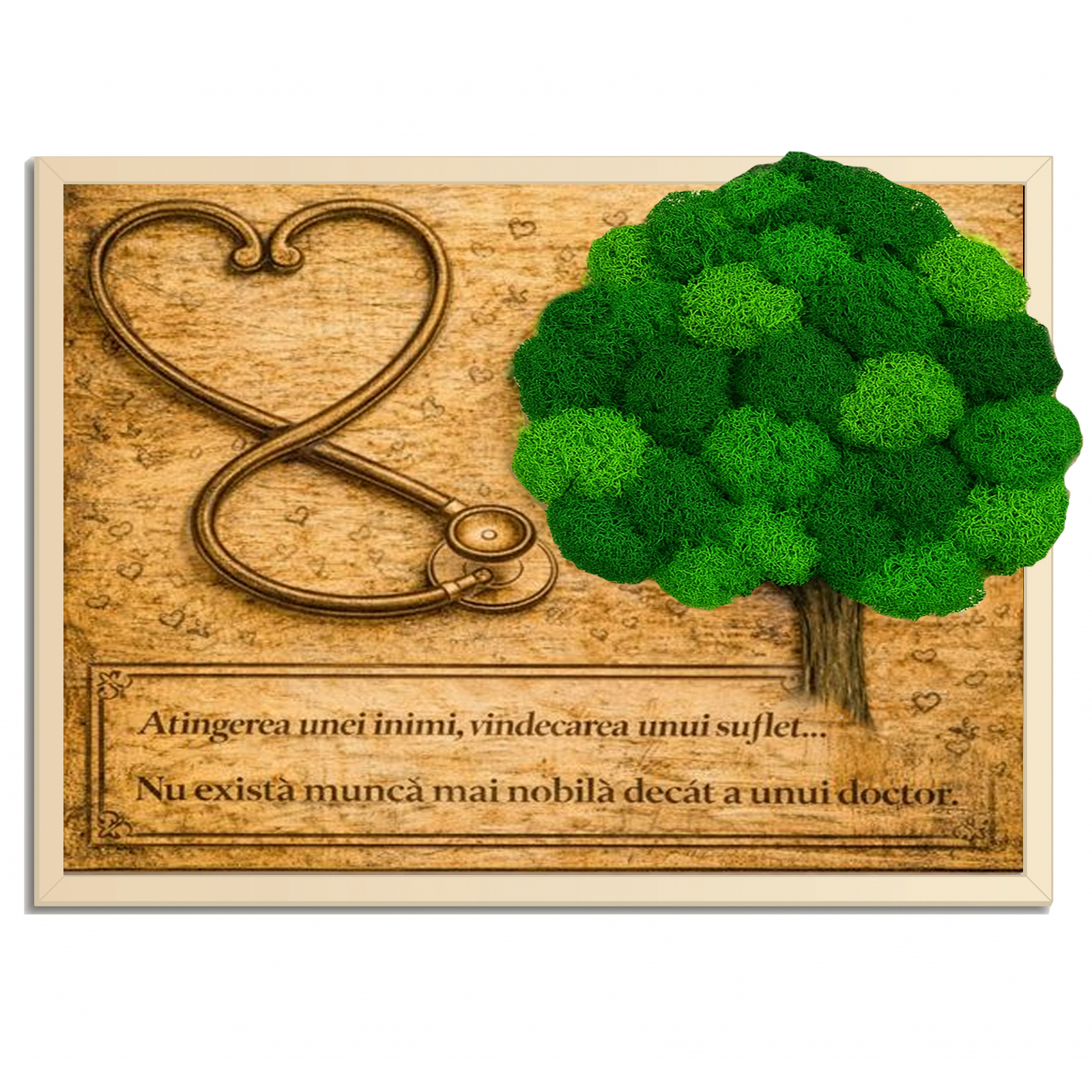 Cauți un cadou pentru doctor care să fie elegant, respectuos și memorabil? Un tablou din lemn personalizat cu text, completat cu licheni naturali stabilizați, este o alegere premium pentru a transmite apreciere într-un mod discret și rafinat. Poți personaliza cu nume, titulatură, specializare, un mesaj de recunoștință, o frază motivațională sau chiar un citat scurt care îl reprezintă.